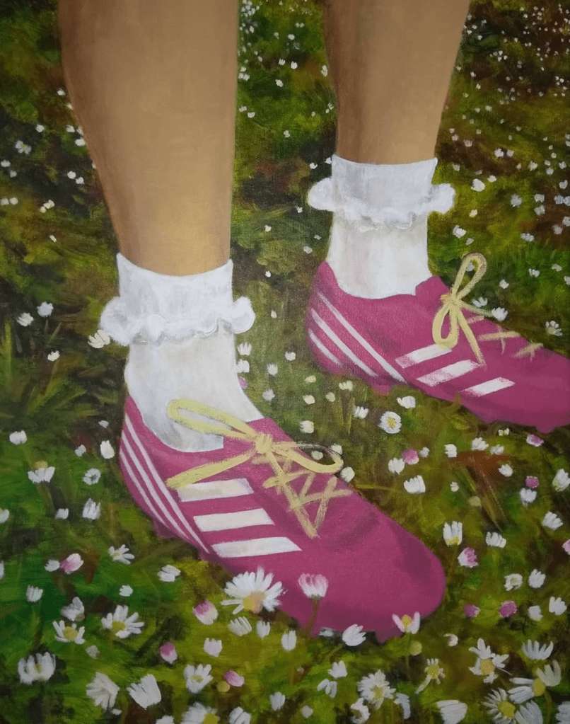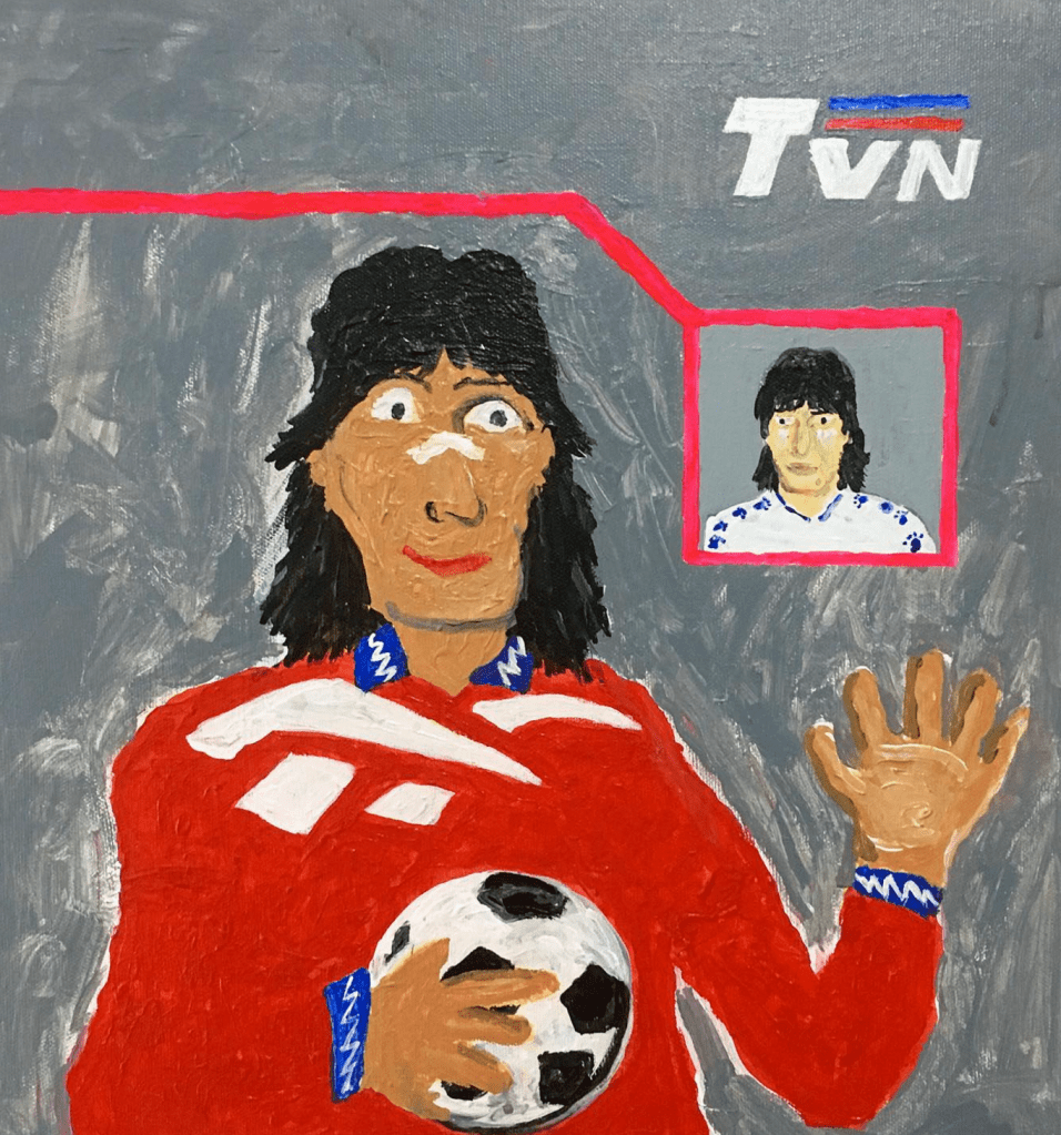 Me gusta harto la obra de Enrique Flores. Él junto a otrxs artistas tenían una galería que se llamaba Daniel Morón, tenían harta obra relacionada con el fútbol y en especial Enrique siempre trabajó con imagenes futboleras que se reconocen muy pop, por ejemplo la Libertadores de Colo-Colo con Boca, cuando el perro le muerde el poto al jugador argentino, me gusta y me llama mucho la atención su obra. En Iquique está Camilo Ortega, que trabaja con un imaginario deportivo y crítica social. De Argentina me gusta mucho Gordopelota, es un artista que ya está volando alto. Hay otro argentino, El Mar Ian, que hace murales increíbles sobre fútbol. Miss Ruth, una chica inglesa que mezlca mucho el paisaje y los zapatos de fútbol. Hay un sitio que se llama Patterns Of Play que trabaja harto con este tipo de contenidos, ahí he ido conociendo varios referentes.