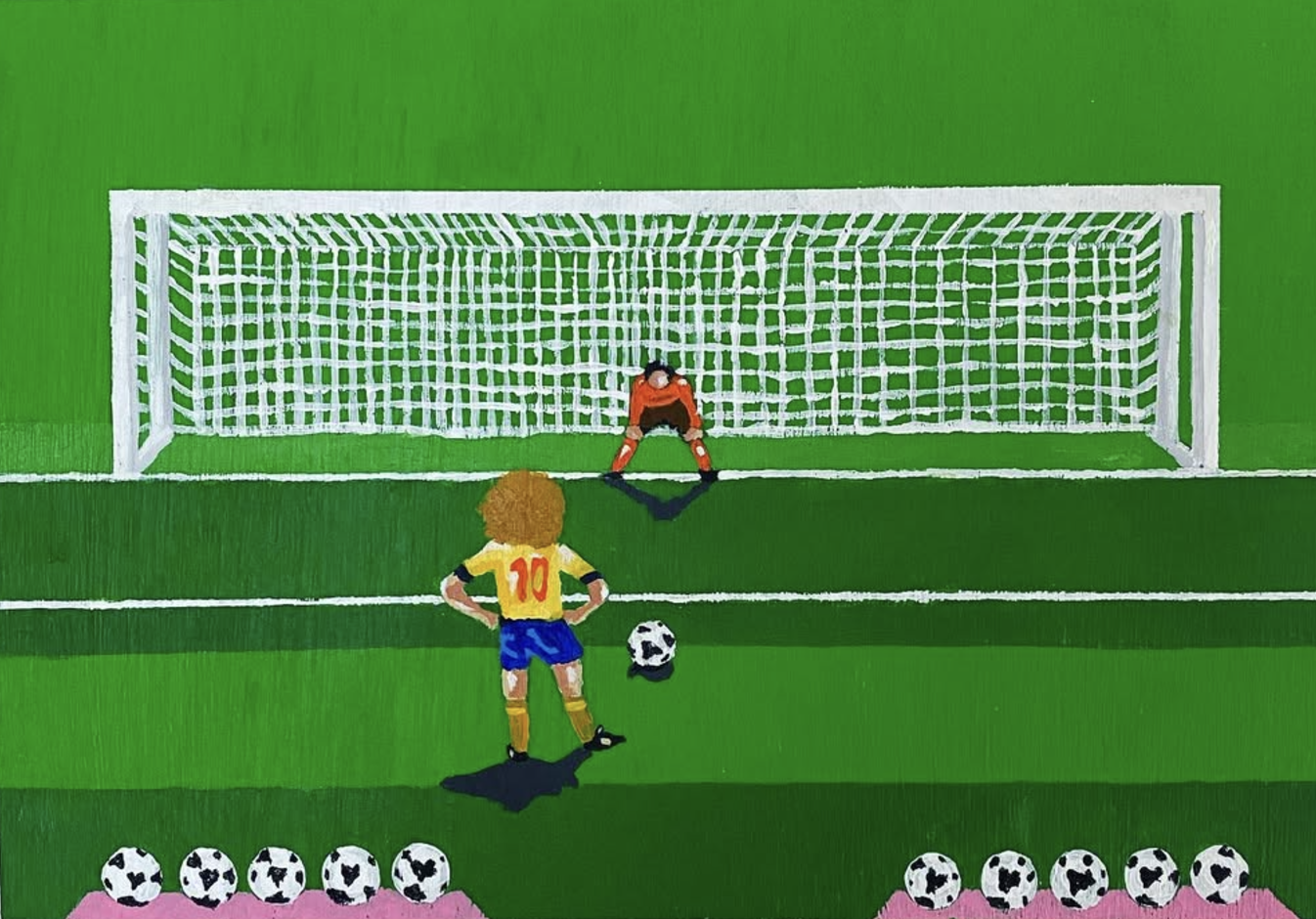 Quisiera hacer algo en Rancagua y llevar todas las obras que tengan relación con fútbol. Quiero hacer una obra relacionada con algún clásico de la región o con algún equipo, como Cóndor de Pichidegua, donde viven mis viejos, el mismo O’Higgins o Santa Cruz. También estoy trabajando en una serie que tiene que ver con Roberto Baggio, tengo una fijación con este jugador y su peinado mullet, él lo puso muy de moda en los noventa, el chocopandero, como lo conocemos. Voy a empezar a trabajar con su imagen, pero solamente cuando desvía el penal contra Brasil e Italia pierde el mundial. Baggio se pone a llorar, entonces también tiene esto medio trágico, del sufrimiento. Quiero hacer una serie de esa imagen, la cual tiene muchas fotografías porque está capturada desde todos lados. El jugador tirado en el piso, de espaldas, de pie, en todas sale llorando.