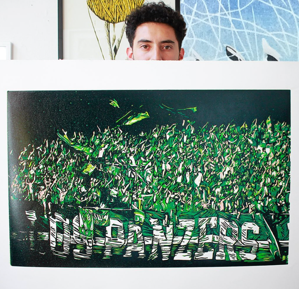 Primero desarrollé la serie Finales, después retraté Barras de Sudamérica, con eso empecé a darle un poco de sentido a esto del fútbol. Luego vino un trabajo más grande, que fue la serie Barras del fútbol nacional en xilografía a gran formato. Desde ahí empiezo a trabajar con fútbol y con comida en paralelo, siento que se mezclan porque corresponden a una cultura popular. Después empecé a ver más lecturas y es la misma gente al final la que le da más lecturas a las obras, desde la imagen, desde el lado pictórico, desde las masas de gente. El mismo fútbol, desde los íconos, las marcas, la estética de las camisetas. Ahí empecé a averiguar más y pude ver que hay todo un mundo, una subcultura de nicho a partir del fútbol que también tiene cosas interesantes, se mezcla la política, es un asunto super sociocultural y muy identitario de cada país, de cada zona. La misma cuestión de las canchas, de los equipos locales, te puedes extender a mucho más y decir «Bueno, aquí hay un lenguaje». Esto en verdad tiene un poder y tiene un contenido superfuerte, no es nada banal, me carga cuando dicen que el fútbol es opio.